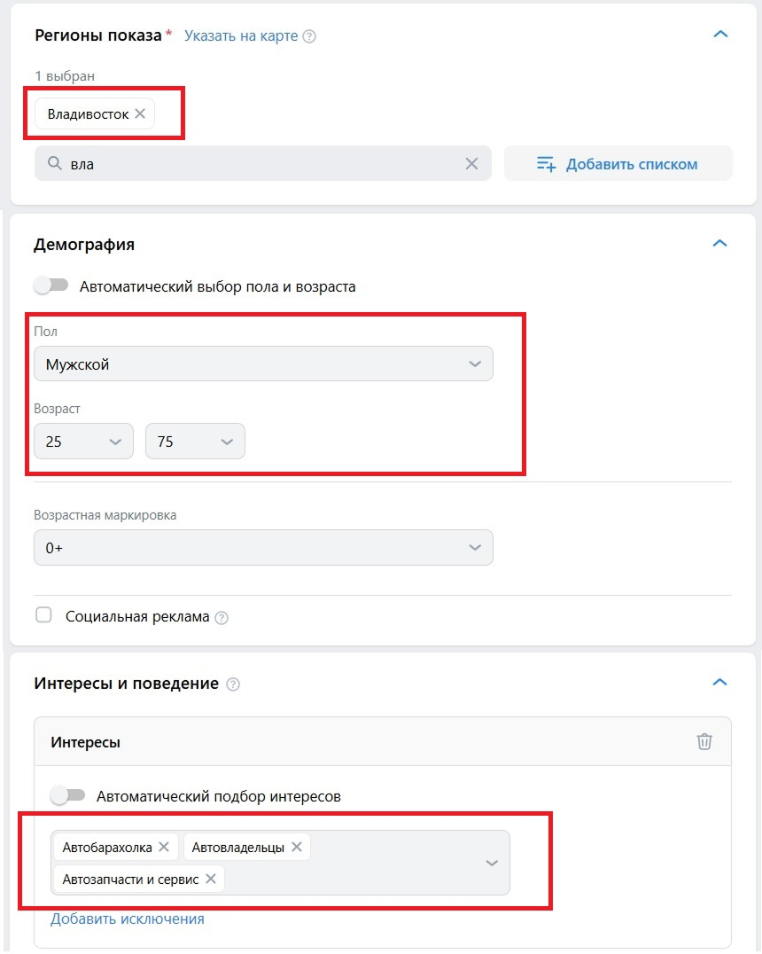 Это значит, что в итоговую выборку попадут те пользователи, которые соответствуют всем данным условиям по списку: география, пол, возраст и интересы. Но при этом интерес учитывает хотя бы один. То есть если мужчина интересуется автозапчастями, но не является автовладельцем, он все равно попадет в нашу аудиторию.