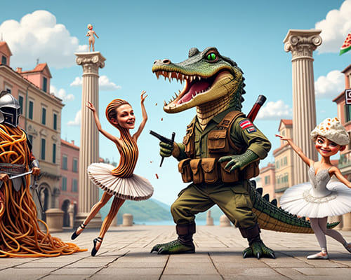 После акулы появились и Бомбардиро Крокодило – какой-то киберпанк-крокодил с крыльями и корпусом двухмоторного самолета прошлых лет, ну получается, бомбардировщик-крокодил. Затем в сеть вышла Балерина Капучина (или Балерина Капучино) – женщина в балетной пачке с чашкой кофе вместо головы. Тунг Тунг Тунг Сахур – это живое полено с битой в руках, поговаривают, что название отсылает к игре на барабанах. Кто еще есть… Лирили Ларила – слон-кактус в одном шлепанце, Шпиониро Голубиро – голубь в плаще лейтенанта Коломбо типичного детектива, Бомбини Гусини (Гузини) – гусь-бомбардировщик с крыльями от самолета, Бобрито Бандито – бобер-гангстер в плаще и шляпе с ПП Томпсона в руках и сигарой в зубах. Персонажей уже огромное количество. К каждому полагается звуковая дорожка, в которой что-то о нем рассказывается.