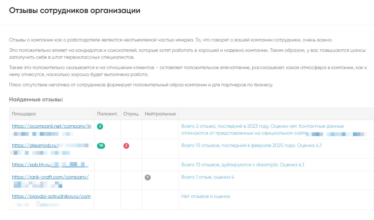 Удаление недостоверной информации о компании. Также проанализировали отзывы на всех площадках — обнаружили, что некоторые негативные из них не соответствуют действительности (вероятно, подтянулись из карточек конкурентов) + затрагивают честь и достоинство сотрудников.