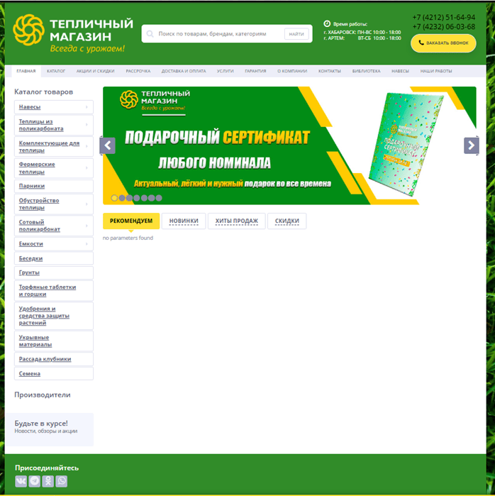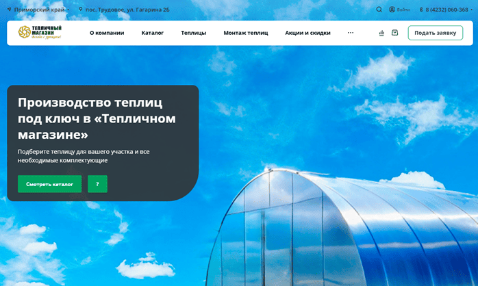 Баннер на главной с акцентом на локальную специфику («Теплицы для Дальнего Востока»),