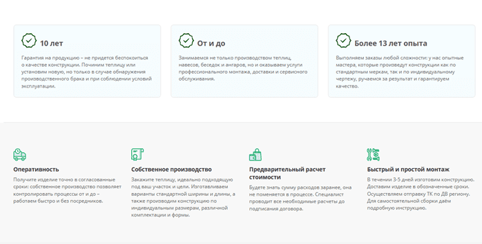 Для каждого текста на сайте — от главной страницы до карточки товара — мы разработали чёткую иерархию блоков. Это значит, что информация подаётся пошагово: сначала — главное (выгода, УТП), затем — аргументы (технологии, материалы, опыт), и только потом — детали и технические нюансы. Такой подход помогает пользователю легко воспринимать контент, не перегружая его, и мягко вести к принятию решения — будь то звонок менеджеру или выбор модели теплицы.