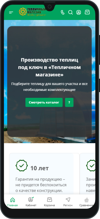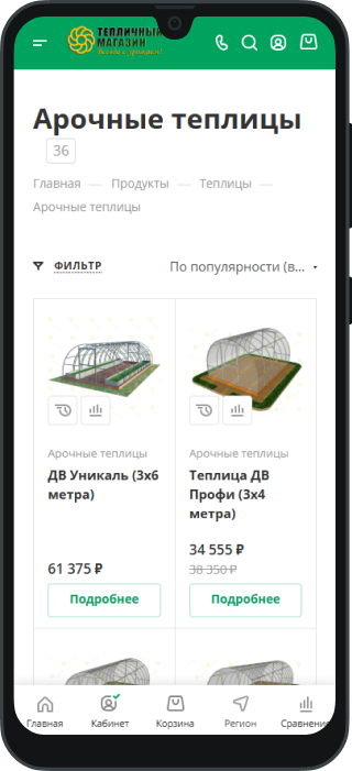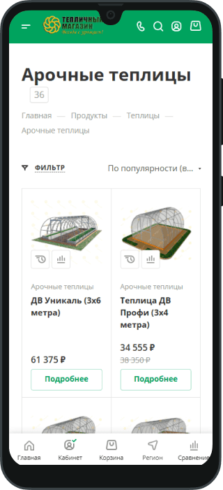 Гибкая фильтрация в каталоге. Реализована фильтрация теплиц по размерам — одна из главных потребностей клиентов. Пользователь быстро находит модель под свой участок, что повышает вовлечённость и сокращает время до покупки.
