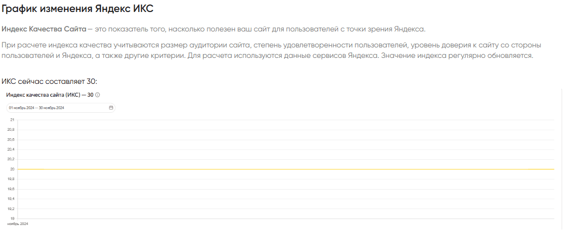 Параметр ИКС на начальном этапе сразу после разработки составил 30, что доказывает, что задача по разработке удобного и понятного сайта была выполнена. В дальнейшем будем работать над повышением показателя в рамках SEO-оптимизации.